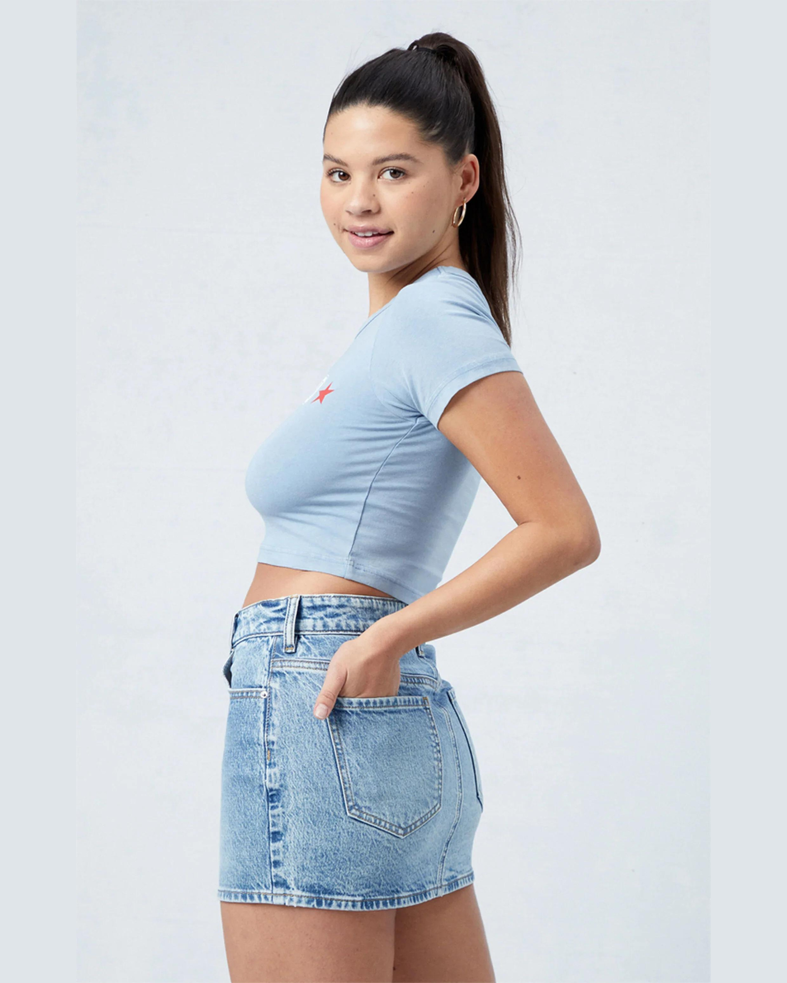 Ontdek de DEMY denim rok - een sexy en slanke knooprok met een hoge taille en een ultra korte lengte, perfect voor de zomer. Deze rok combineert casual streetwear met een trendy uitstraling en een nauwsluitende pasvorm, waardoor hij ideaal is voor elke gelegenheid. Of je nu een dagje uit gaat of een avondje stappen, deze denim rok maakt je outfit compleet.